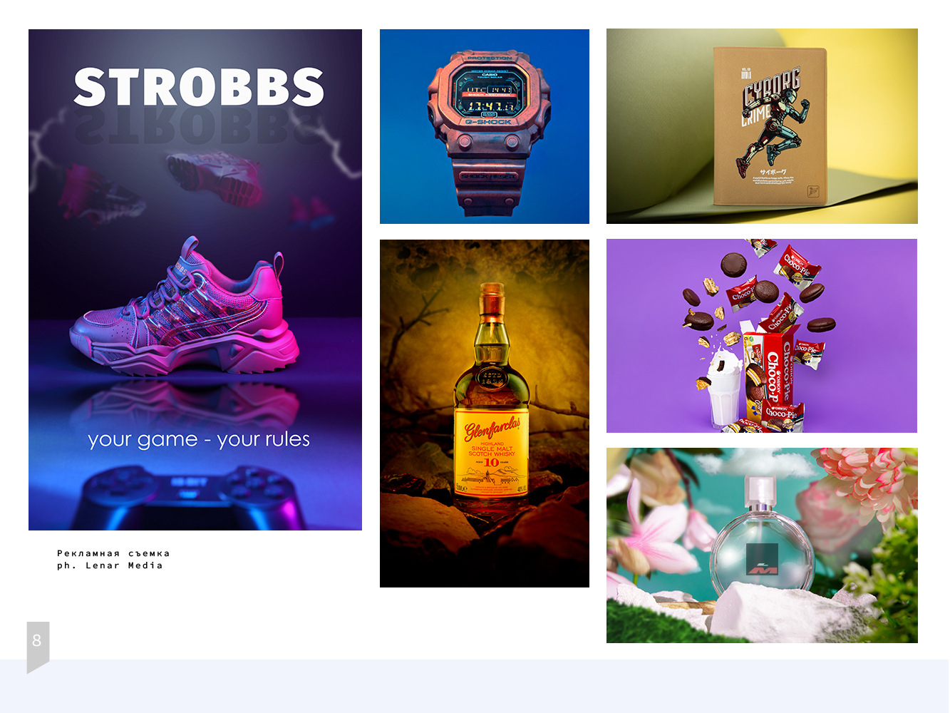 Креативная фотосъемка с использованием реквизита, специальных фонов, света, добавлением элементов - левитации, дыма и т.д. Подходит для главных фото на маркетплейсах, сайта, баннеров, каталога. Эффектная реклама, которая привлекает и удерживает внимание.